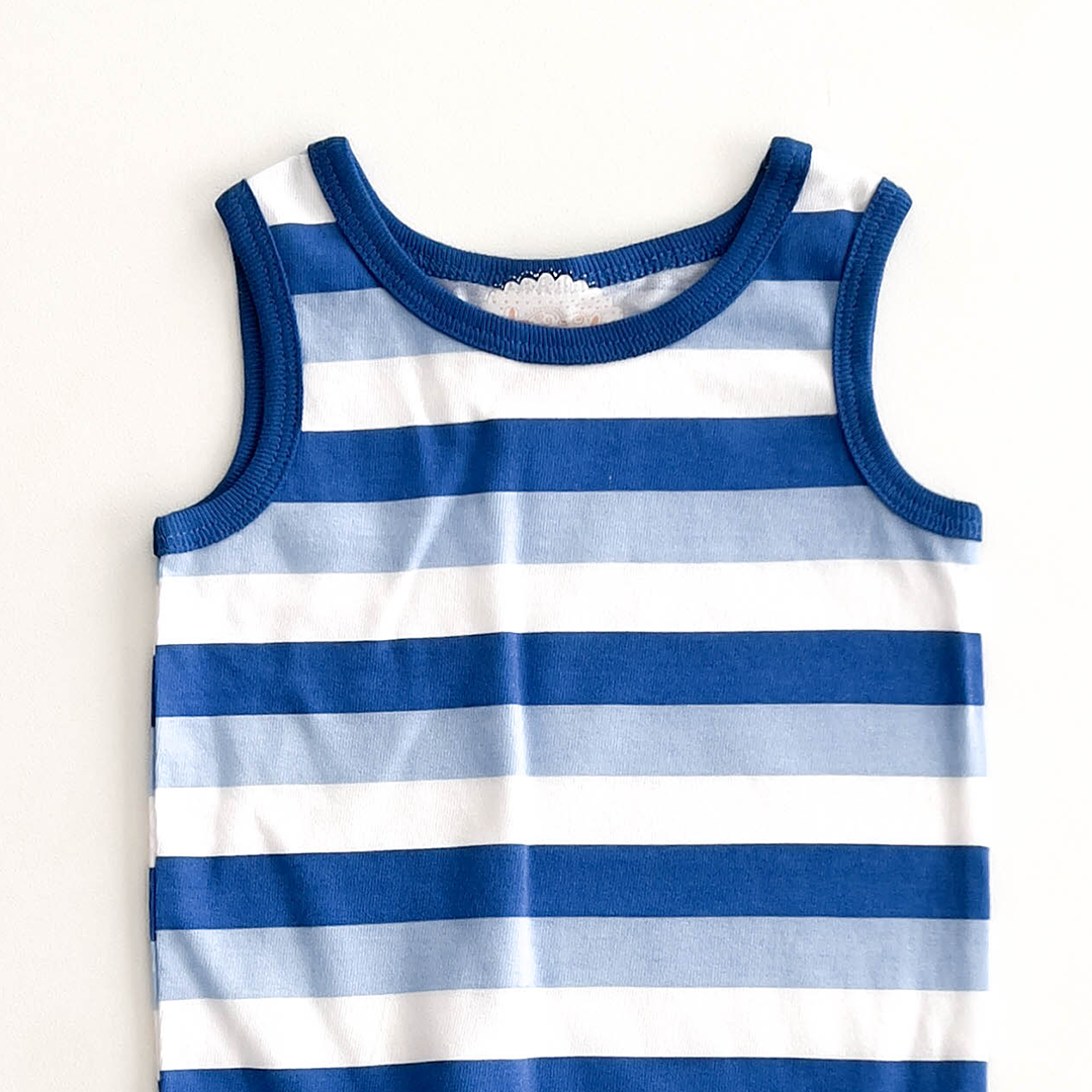 BLUE AND WHITE LINED SLEEVELESS ONESIE